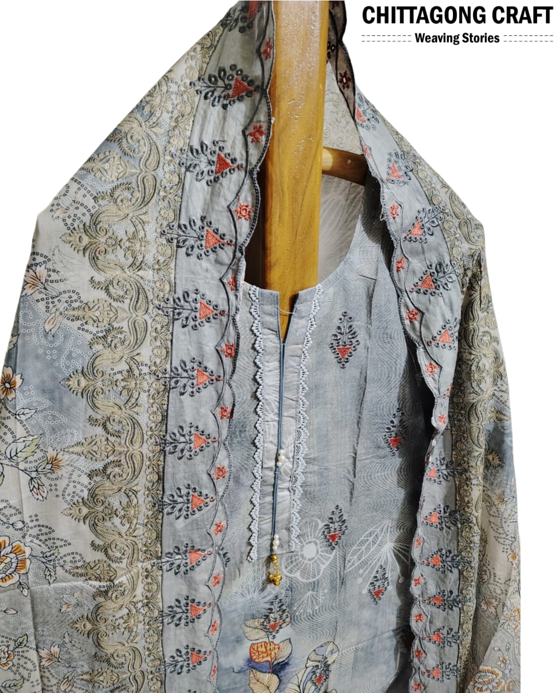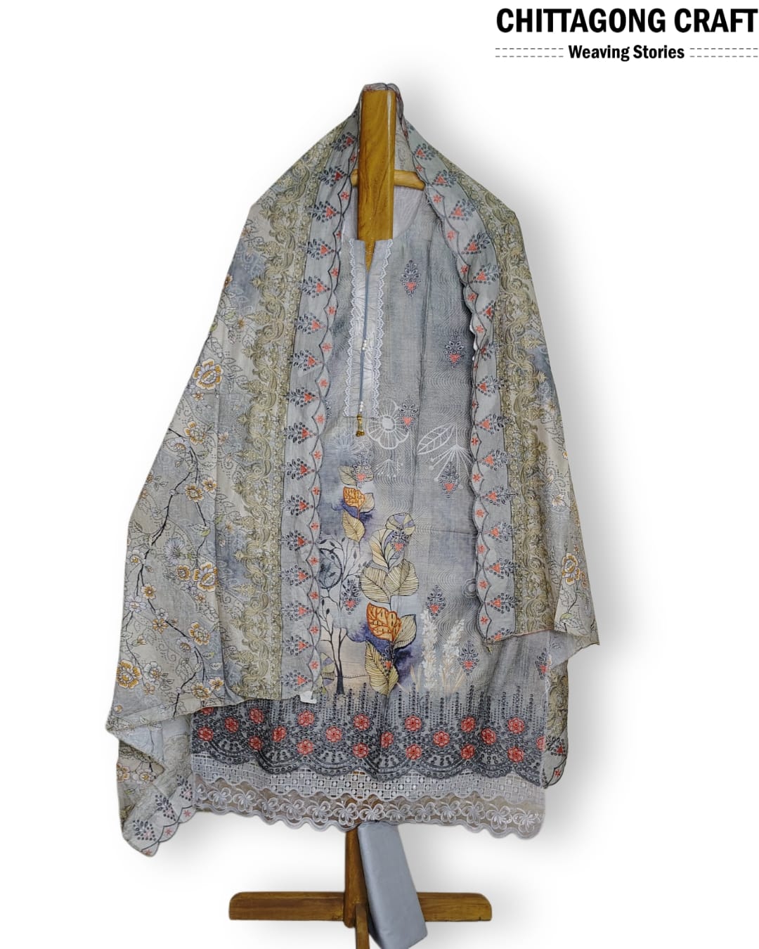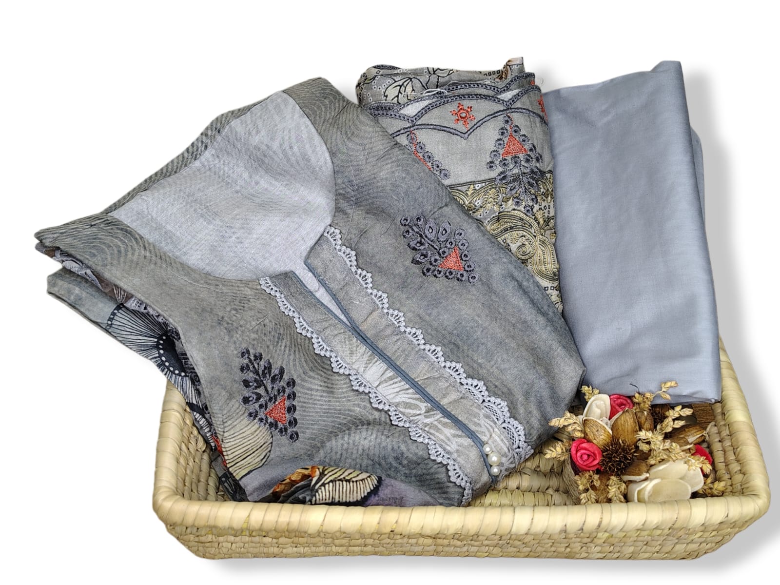 Wrap yourself in effortless grace with this digital printed three-piece set — a perfect blend of subtle charm and artistic detail. The soothing grey base is beautifully adorned with floral motifs and intricate embroidery-inspired prints, giving it a timeless appeal. Lightweight, breathable, and refined — ideal for both daytime elegance and evening poise.