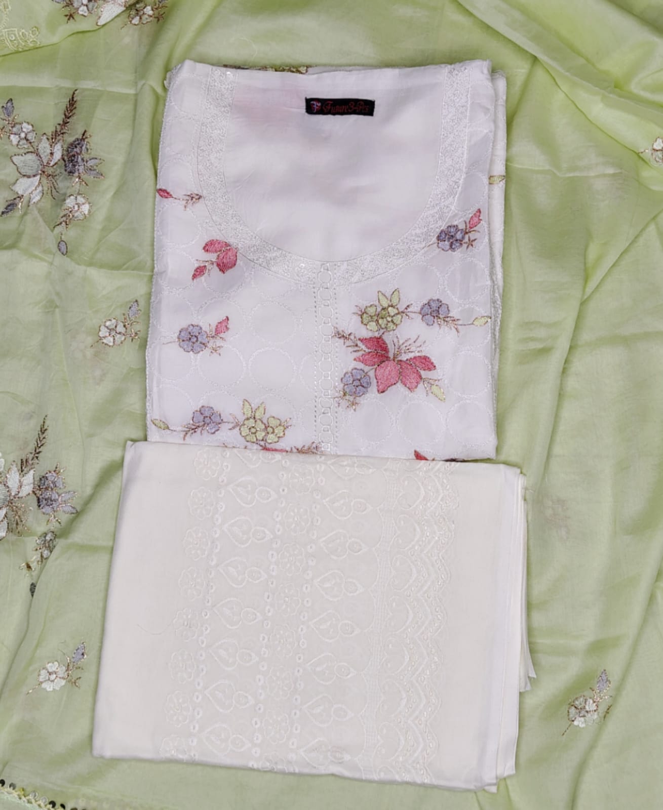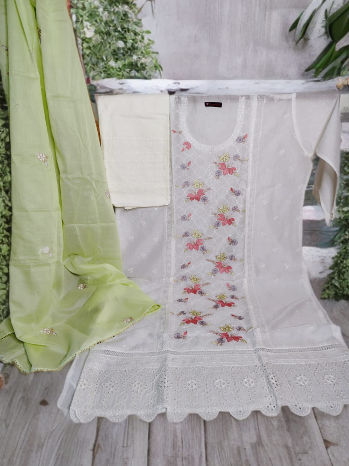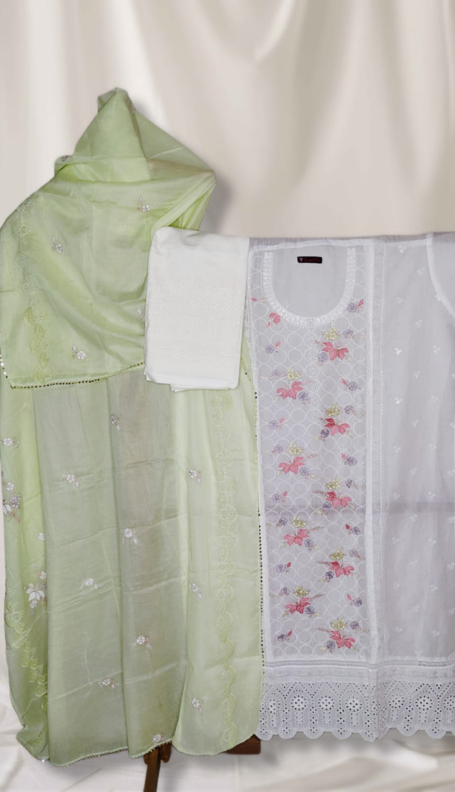 ✨ Dupatta: A refreshing light green cotton & organza dupatta with embroidered motifs and scalloped lace borders, adding a subtle yet vibrant contrast to the white base.